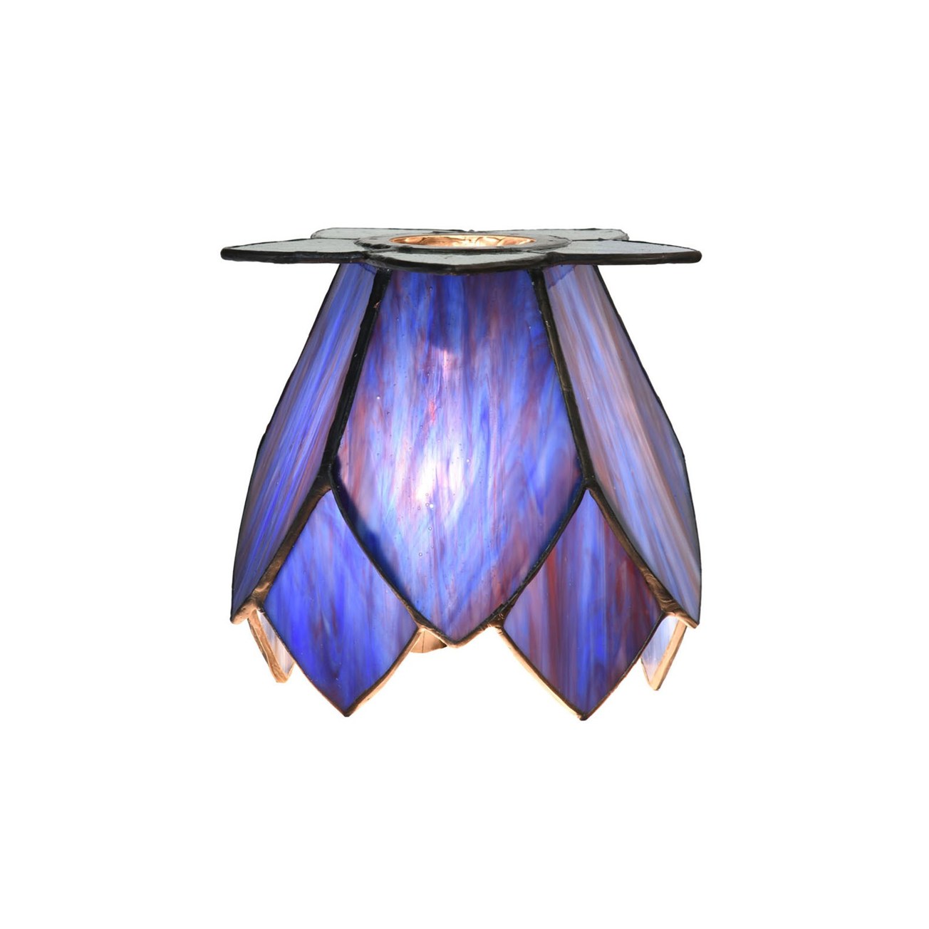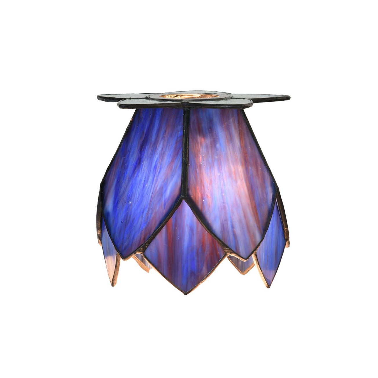 De Tiffany glaskappen zijn vormgegeven als elegante lotusbloemen en vervaardigd van diepblauw glas met subtiele paarse kleurschakeringen, die prachtig zichtbaar worden wanneer de lamp brandt. De combinatie met frisgroene accenten aan de basis zorgt voor een harmonieus en natuurlijk geheel.