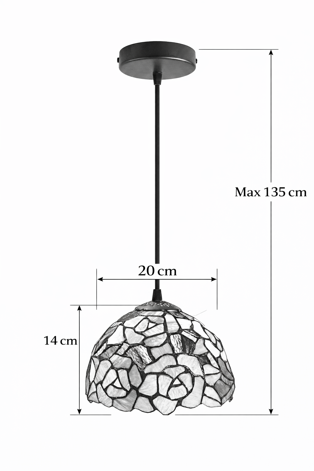 Deze uitvoering hangt niet aan een ketting maar aan een snoer van 135 cm, dat eenvoudig is in te korten. Ideaal voor wie een speelsere of modernere ophanging zoekt met de charme van klassieke Tiffany verlichting.