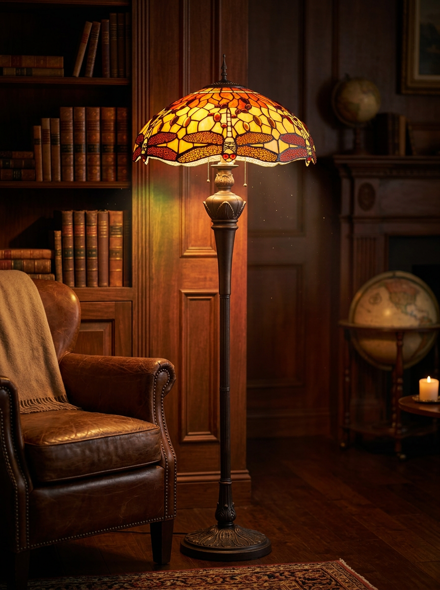 Een warme en stijlvolle Tiffany vloerlamp met amberkleurig libelle-motief, perfect als sfeervolle eyecatcher in een klassiek of landelijk interieur.