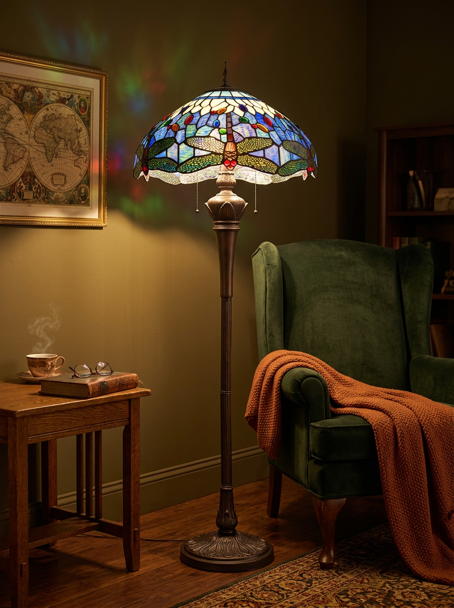 Een klassieke Tiffany vloerlamp met libelle-motief, perfect als sfeervolle eyecatcher in een vintage, landelijk of klassiek interieur.