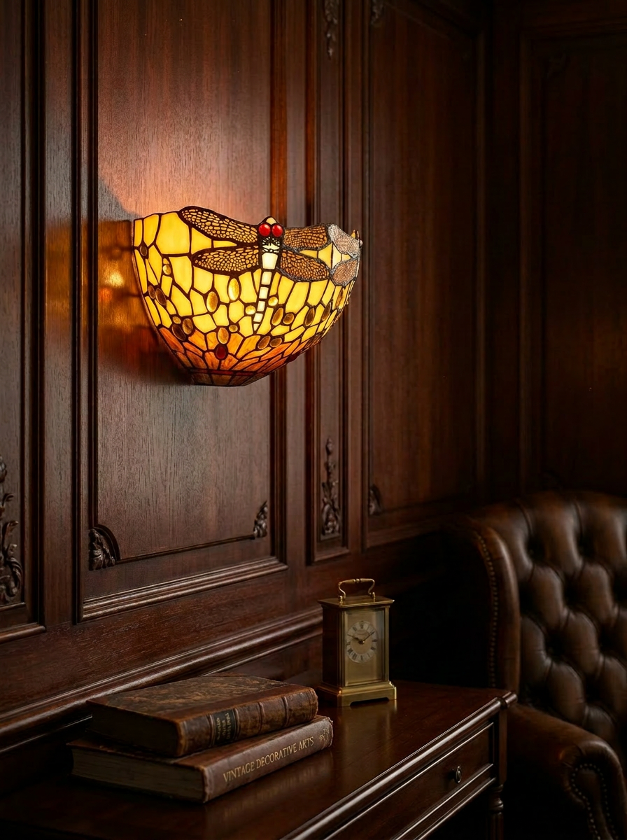 Een sfeervolle Tiffany wandlamp met amberkleurig libelle-motief, perfect voor een warm en stijlvol interieur.